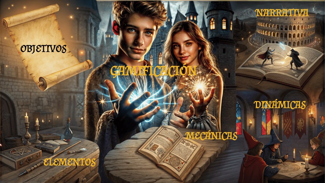 La Gamificación se sustenta en la rica y envolvente narrativa presentada en los tres primeros capítulos de la obra, que sumerge al alumnado en un espacio mágico lleno de posibilidades. Esta narrativa no solo capta la atención de los estudiantes, sino que también los convierte en protagonistas activos de la historia, favoreciendo una experiencia de aprendizaje profundamente inmersiva, flexible, adaptativa, participativa y motivadora intrínsecamente. Al situar al alumnado en el centro de la acción, esta metodología impulsa su compromiso y lo convierte en agente de su propio aprendizaje.